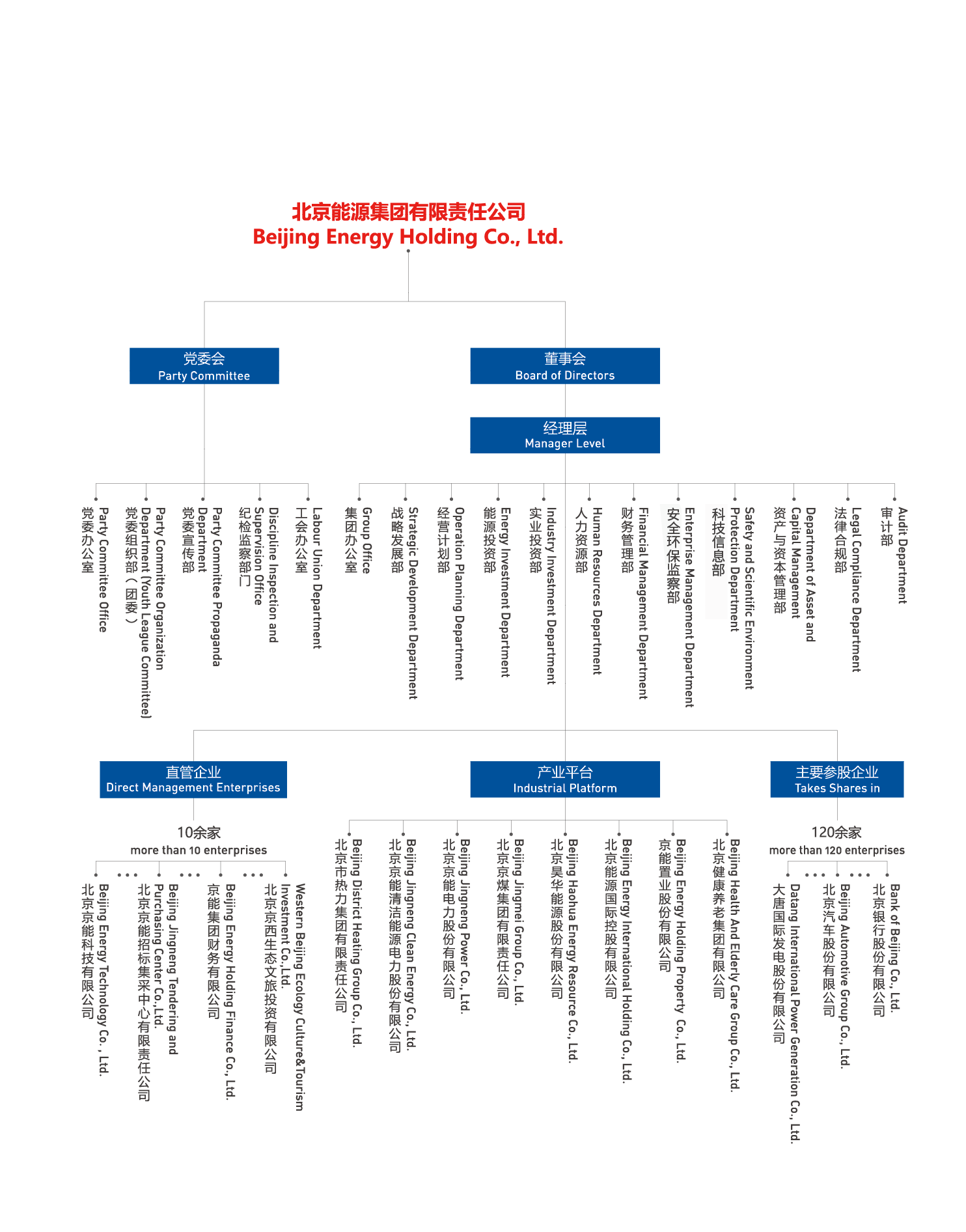 北京能源集團(tuán)有限責(zé)任公司(以下簡(jiǎn)稱“京能集團(tuán)”或“集團(tuán)”)是北京市人民政府出資設(shè)立的國(guó)有獨(dú)資公司,肩負(fù)著保障首都北京能源安全可靠供應(yīng)的重任。集團(tuán)成立于2004年,由原北京國(guó)際電力開發(fā)投資公司和原北京市綜合投資公司合并而成,2011年、2014年先后又與北京市熱力集團(tuán)有限責(zé)任公司、北京京煤集團(tuán)有限責(zé)任公司實(shí)施合并重組,實(shí)現(xiàn)了產(chǎn)業(yè)鏈條融合互補(bǔ)。經(jīng)過(guò)多年的資源整合,集團(tuán)由單一能源產(chǎn)業(yè)發(fā)展為熱力、電力、煤炭、健康文旅等多業(yè)態(tài)產(chǎn)業(yè)格局。2024年底,集團(tuán)資產(chǎn)規(guī)模達(dá)4934億元,年?duì)I業(yè)收入975億元,全資及控股企業(yè)860余家,參股企業(yè)120余家,擁有員工3.4萬(wàn)余人,投資區(qū)域遍布全國(guó)33個(gè)省市區(qū)以及海外,控股京能清潔能源、京能電力、昊華能源、京能置業(yè)、北京能源國(guó)際、京能熱力六家上市公司,盈利水平長(zhǎng)期穩(wěn)居北京市屬企業(yè)前列。2024年在中國(guó)企業(yè)500強(qiáng)排名第247位,中國(guó)服務(wù)企業(yè)500強(qiáng)排名第87位。